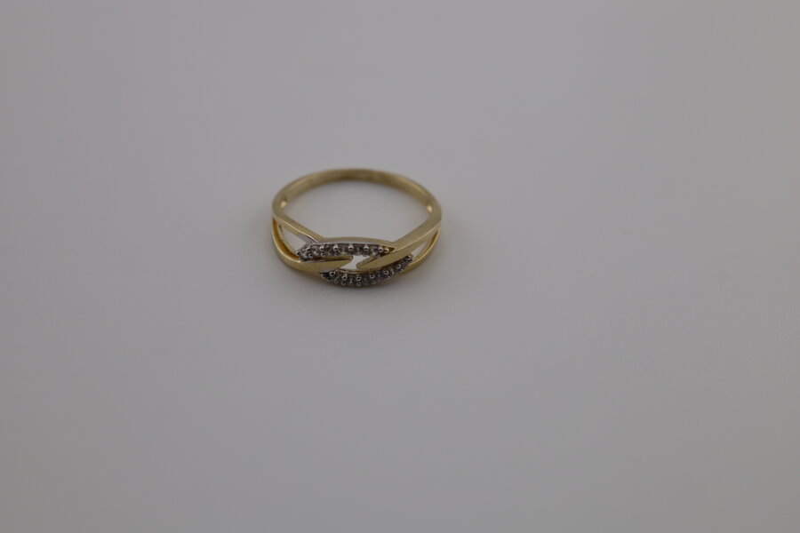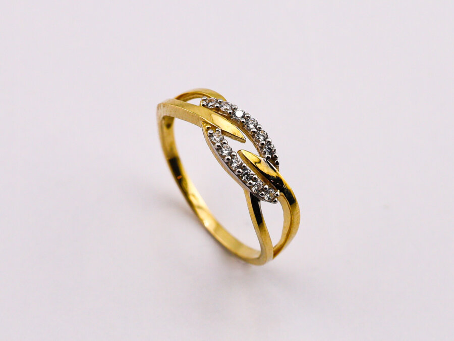 Dámsky zlatý prsteň s jemne prepletaný s trblietavými kamienkami.Predná časť prsteňa je tvorená prekríženými líniami — jedna hladká, druhá bohato zdobená drobnými čírymi kamienkami.