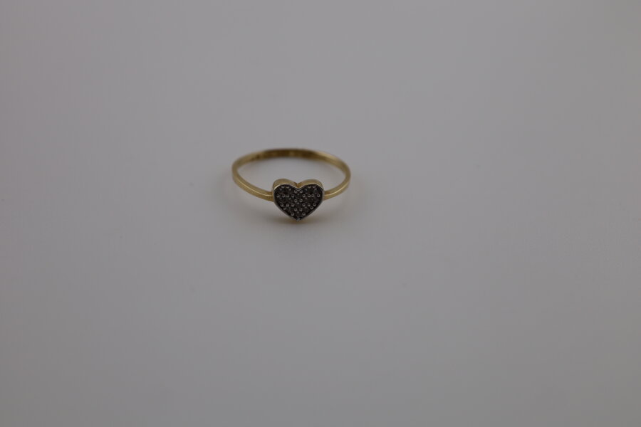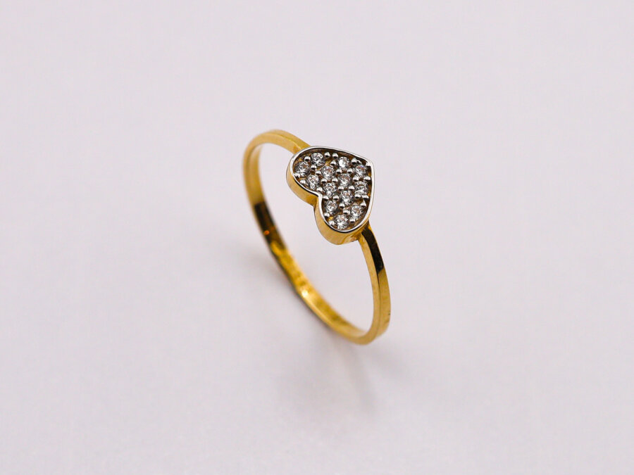 Romantický prsteň zo 14-karátového žltého zlata (585/1000) zdobí srdiečko osadené čírymi zirkónmi. Jemný a elegantný šperk.