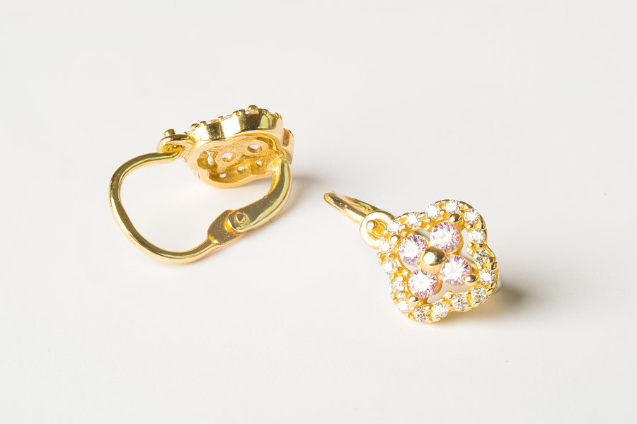 Detské zlaté náušnice sú zo žltého zlata. Náušnice zdobia biele okrúhle zirkóny. Zapínanie je na háčik v prednej časti náušníc.