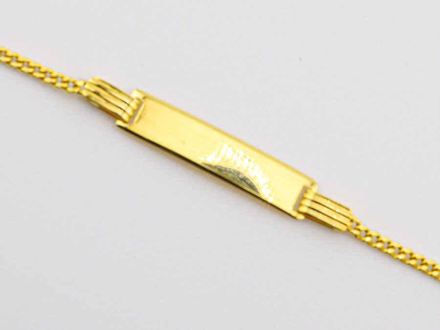 Detský náramok zo žltého zlata s obdĺžnikovou hladkou platničkou a pevnejšou dvojitou retiazkou – elegantný, klasický a veľmi vhodný na gravírovanie.