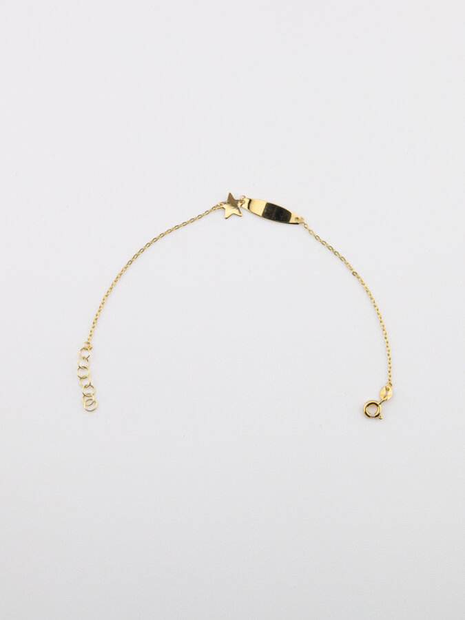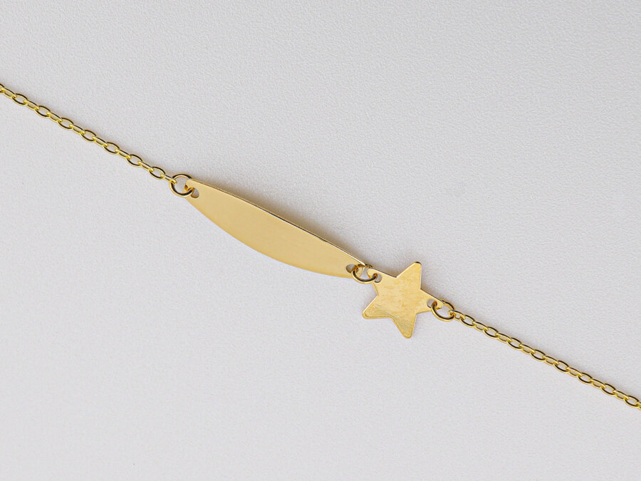 Tento náramok je jemný, detský, zo žltého zlata, s malou hviezdičkou a platničkou, ktorá sa výborne hodí na gravírovanie mena či dátumu narodenia. Ideálny ako darček pre dieťa – pri krstinách, narodeninách alebo inej výnimočnej príležitosti.