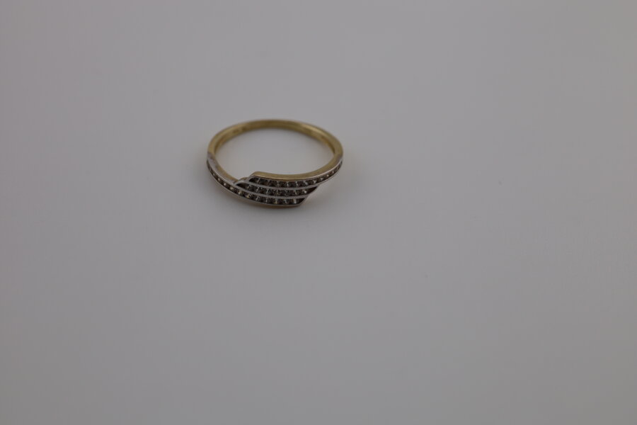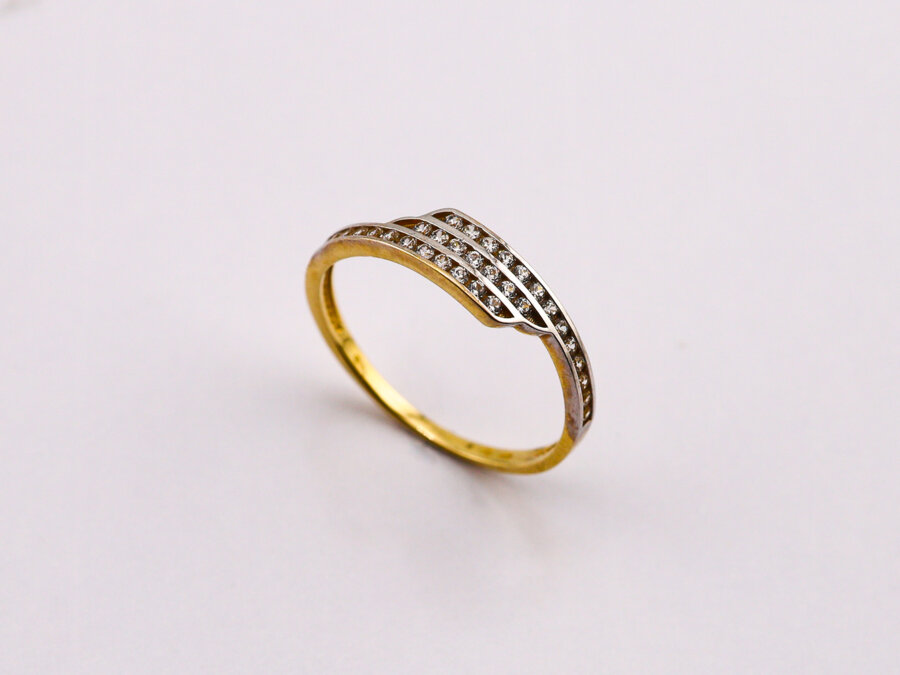 Dámsky zlatý prsteň s elegantným vzorovaným zdobením, ktoré vytvára zaujímavý a nadčasový efekt.Predná časť prsteňa je tvoraná prevedení, ktorý krásne vyniká na pozadí žltého zlata. Vďaka tomu pôsobí prsteň luxusne a veľmi elegantne.