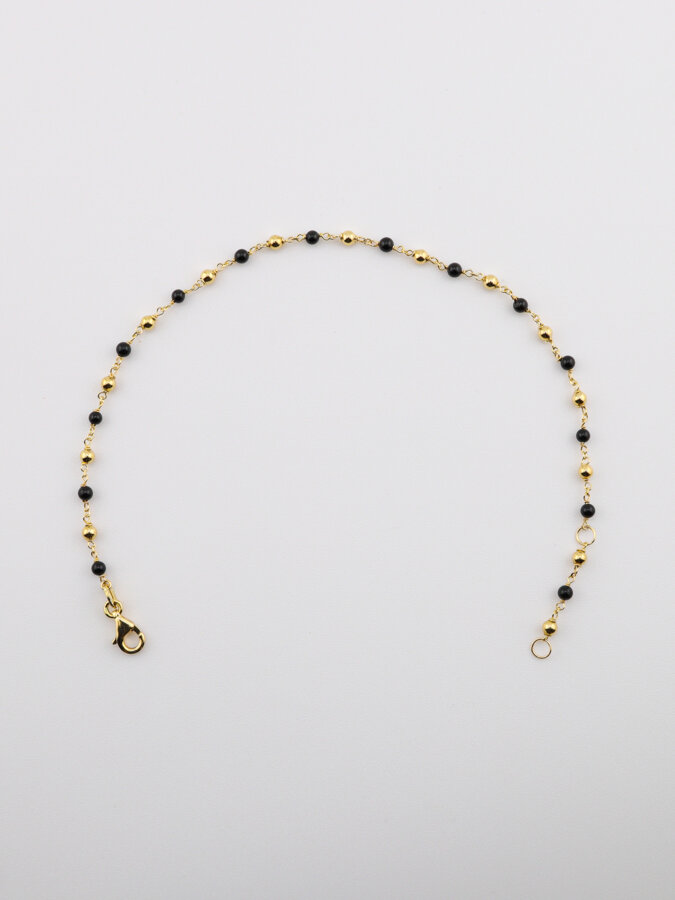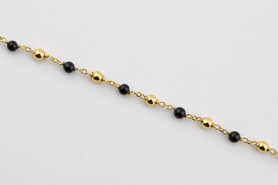 Štýlový náramok so žltými a čiernymi guľôčkami spája eleganciu s moderným kontrastom. Čierne guľôčky dodávajú šperku výraz a hĺbku, zatiaľ čo zlaté prvky prinášajú teplý, luxusný lesk. Ideálny doplnok pre ženy, ktoré milujú rafinovaný dizajn a šperky s osobnosťou.