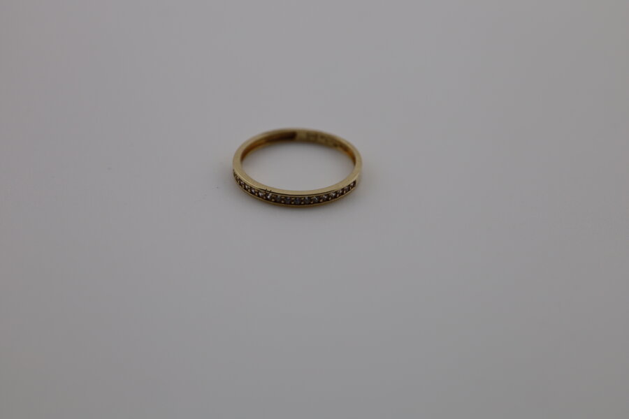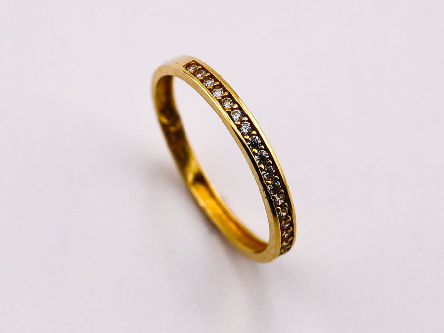 Tento prsteň má klasický dizajn z 14-karátového žltého zlata a je zdobený radom drobných zirkónov po celej hornej línii. Elegantný, decentný a univerzálny – ideálny na každodenné nosenie aj ako doplnok k zásnubnému prsteňu.