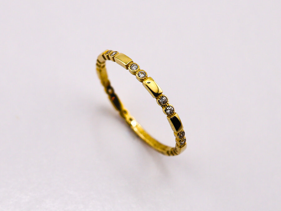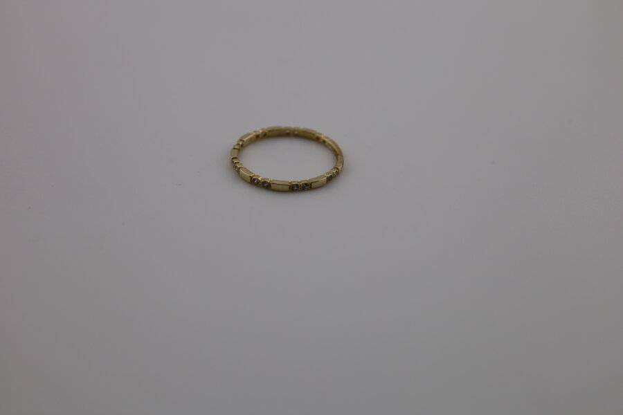 Jemný a elegantný prsteň z 14-karátového žltého zlata (585/1000) je zdobený drobnými čírymi zirkónmi po obvode. Lesklý povrch a precízne spracovanie mu dodávajú luxusný vzhľad pri zachovaní jemnosti a pohodlia na nosenie.
