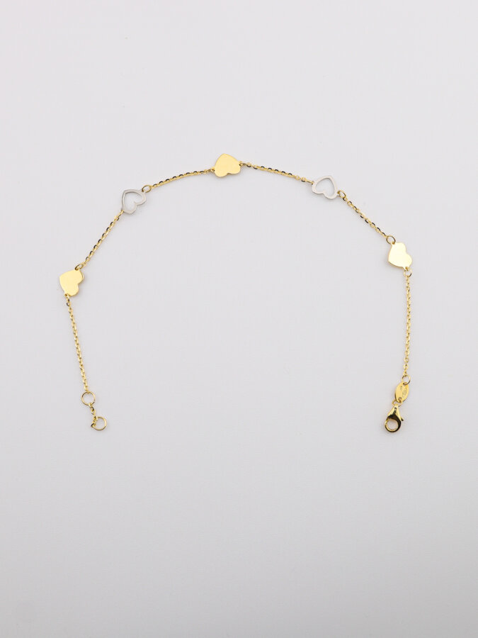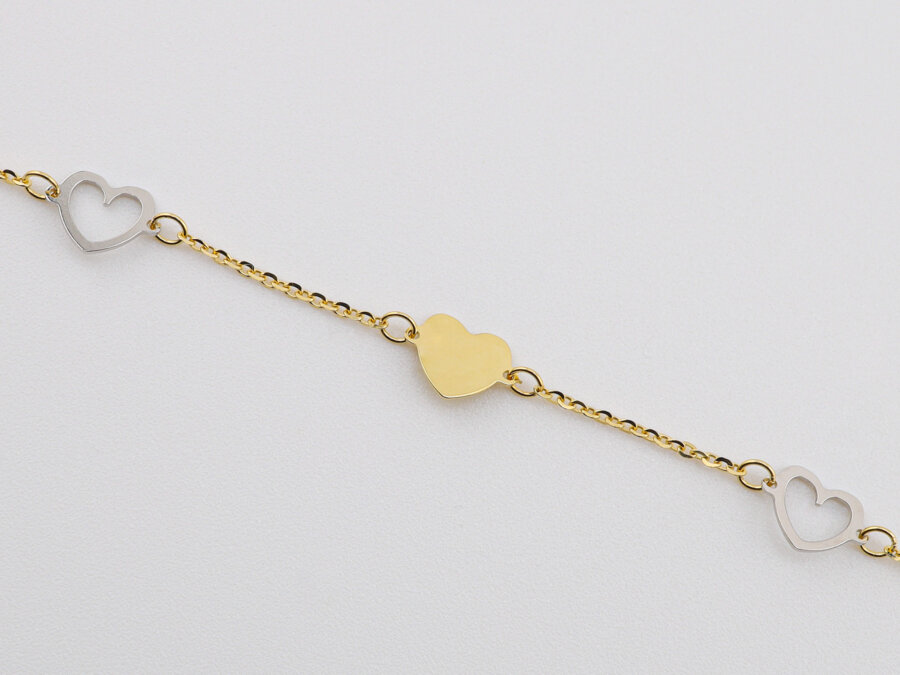 Nádherný náramok, ktorý symbolizuje spojenie sŕdc – plné srdiečko zo žltého zlata vyjadruje silu a lásku, zatiaľ čo biele vyrezávané srdiečko dodáva šperku jemnosť a vzdušnosť. Elegantný doplnok pre ženy, ktoré milujú romantické detaily a nadčasový štýl. Perfektný ako darček z lásky alebo pre seba – zo srdca.