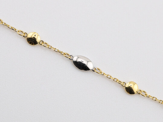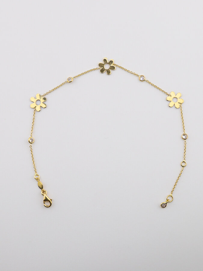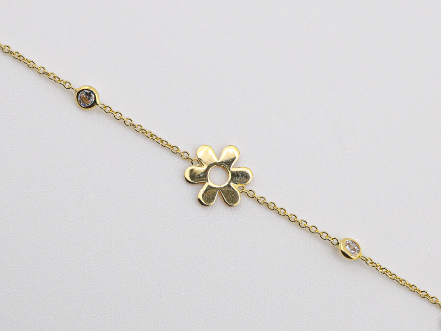 Nádherný zlatý náramok zdobený kvietkom a dvoma trblietavými kamienkami. Kvietok symbolizuje nežnosť a ženskosť, zatiaľ čo kamienky dodávajú šperku iskru a luxusný nádych.