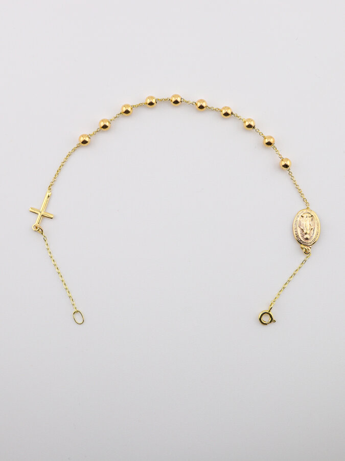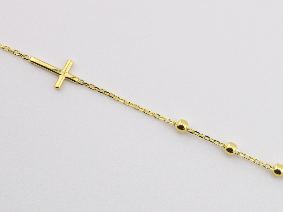 Náramok zo žltého zlata je zostavený z pravidelne radených hladkých guľôčok prepojených krátkymi úsekmi retiazky Anker, medzi guľôčkami sú drobné deliace spojky, ktoré udržujú rovnaký rozostup a dávajú línii rytmu, retiazkové medzidiely poskytujú náramku voľný plynulý ohyb cez zápästie.