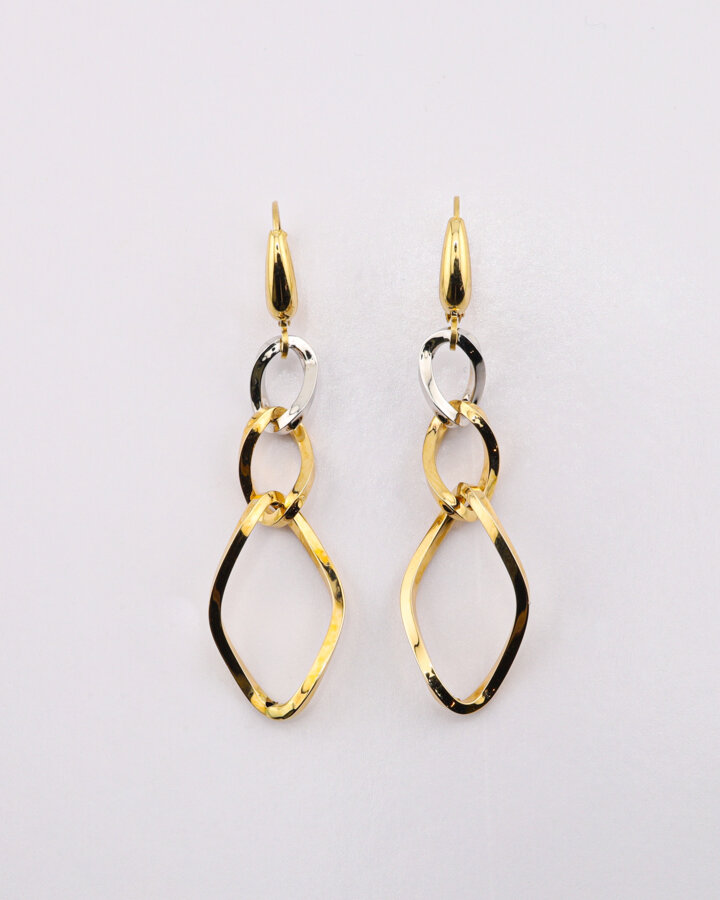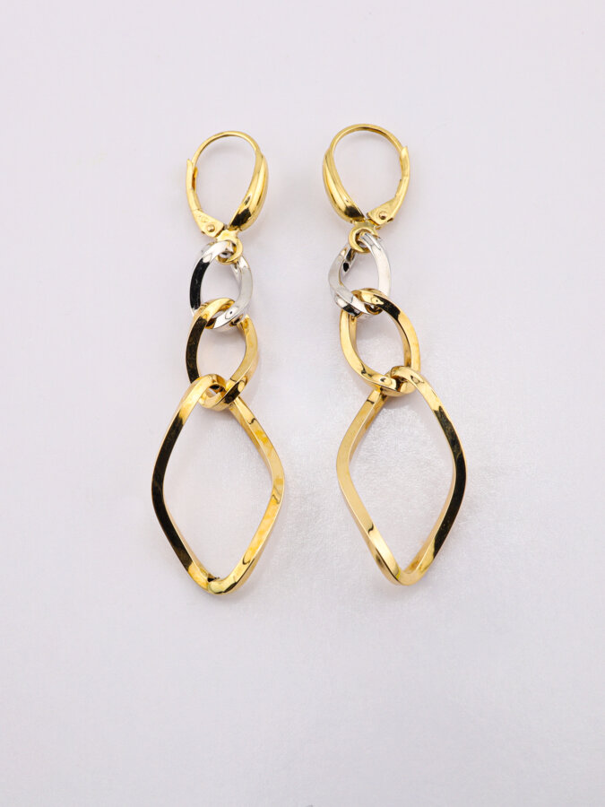 Tieto výrazné náušnice zaujmú kombináciou žltého a bieleho zlata, ktorá im dodáva moderný a sofistikovaný vzhľad. Dizajn tvorí séria prepojených článkov rôznych tvarov a veľkostí, zakončená jemne zvlneným kosoštvorcovým rámom. Lesklý povrch zvýrazňuje svetlo a dodáva náušniciam luxusný nádych. Ideálny doplnok pre ženy, ktoré majú rady originálne šperky s elegantným nádychom.