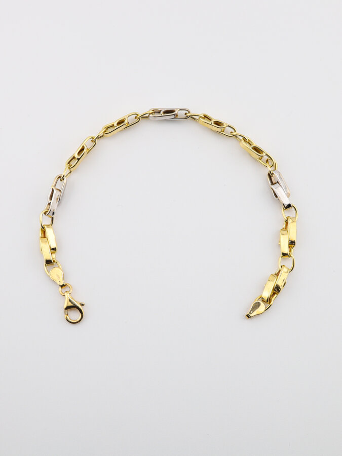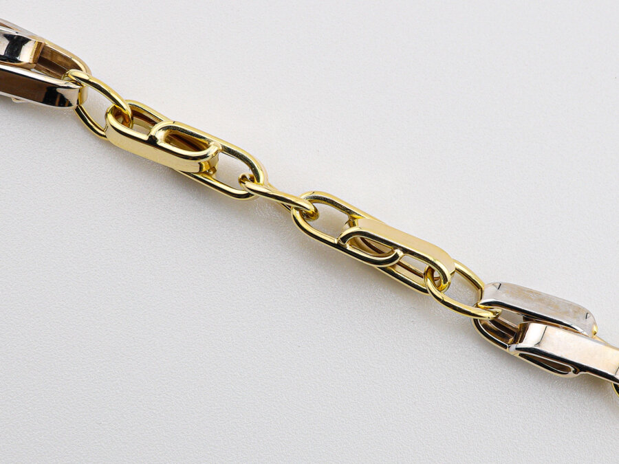 Pánsky zlatý náramok je stelesnením mužskej elegancie a precízneho remesla. Vyrobený z 14-karátového žltého a bieleho zlata, zaujme prepracovanou štruktúrou článkov, ktoré sa prelínajú v harmonickom kontraste dvoch odtieňov kovu.