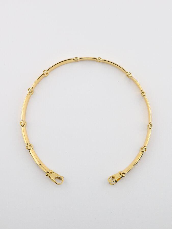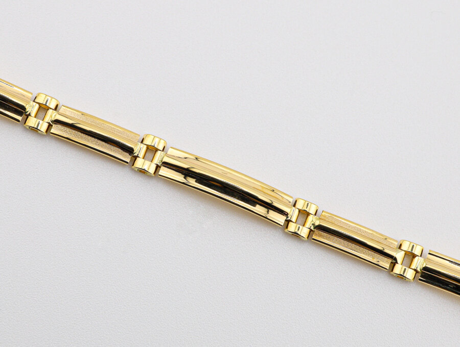 Jeho dizajn spája klasickú robustnosť s modernou eleganciou – ideálny pre muža.Vyrobený z kvalitného 14-karátového žltého zlata, zaujme prepracovanými článkami s čistými líniami a vysokým leskom.