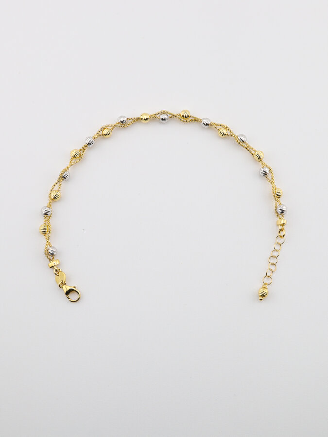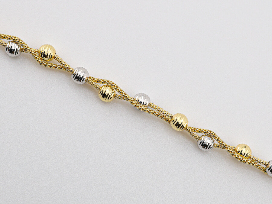 Elegantný náramok zo zlata, ktorého dizajn tvoria prepletené guľôčky v kombinácii žltého a bieleho zlata. Jemný kontrast farieb a precízne spracovanie dodávajú šperku luxusný vzhľad.