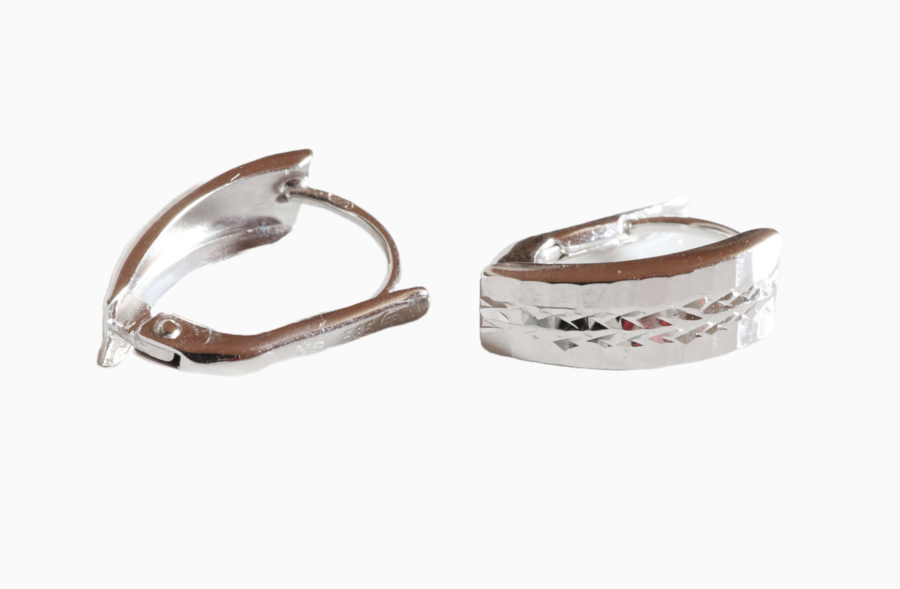 Štýlové náušnice z 14-karátového bieleho zlata (585/1000) s kombináciou hladkého povrchu a jemného gravírovaného vzoru. Tvarované do elegantného oblúčika poskytujú pohodlné nosenie, zatiaľ čo lesklý povrch dodáva šperku luxusný vzhľad.