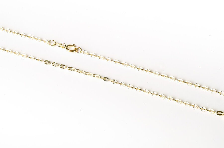 Pekná zlatá retiazka tvorená z podlhovastých očiek a je vyrobená zo 14 karátového žltého zlata.Šperk sa zapína na spoľahlivý pérový krúžok a je vhodný tiež ako dar.