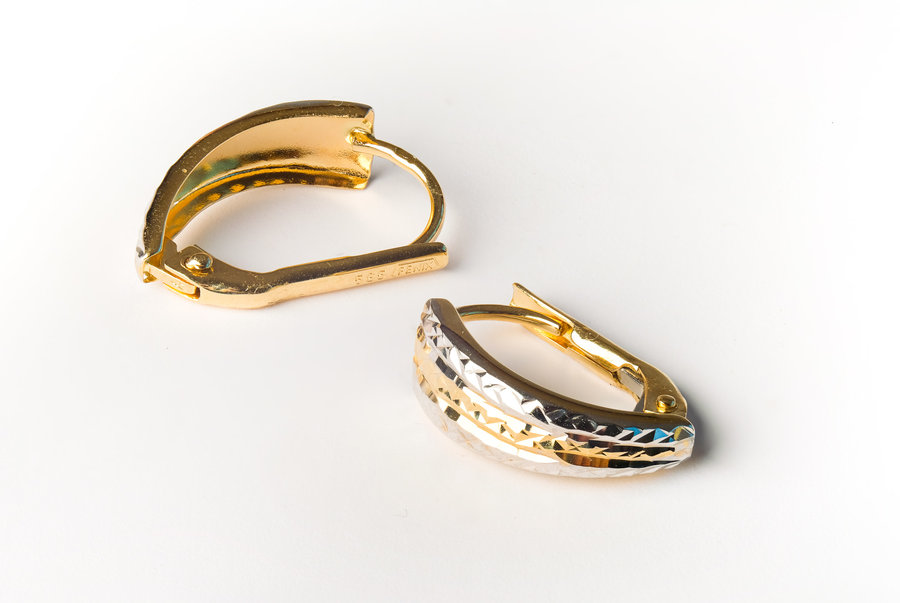 Dámske zlaté kombinované náušnice sú zo žltého a bieleho zlata. Náušnice zdobí po orajoch trblietavý gravír z bieleho zlata . Zapínanie náušníc je na klasický patent.