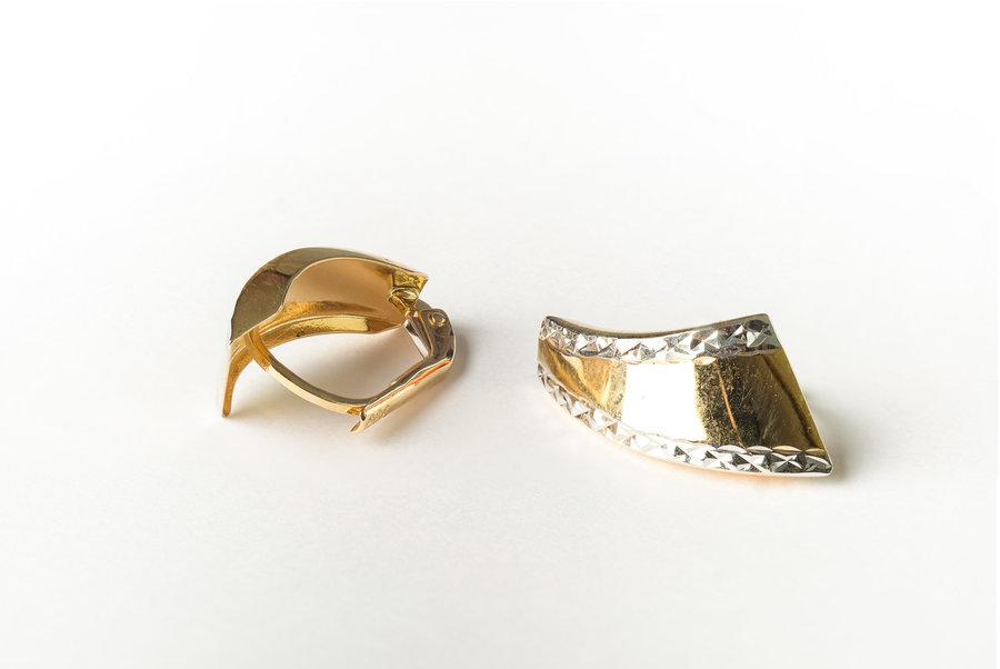 Veľmi pekné zlaté náušnice vyrobené s kombináciou žltého a bieleho zlata. Náušnice majú lesklý povrch a po krajoch sú zdobené s krásnym gravírovaným vzorom z bieleho zlata.
