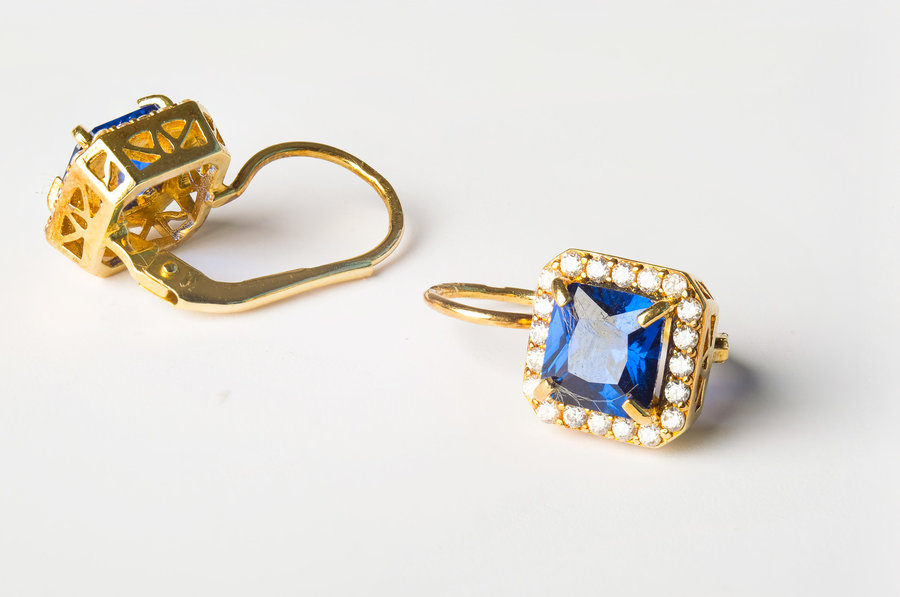 Dámske zlaté náušnice zdobí v strede syntetický zafír v tvare kocky, spolu s bielymi zirkónmi vsadenými dookola. Zapínanie náušníc je na klasický patent. Vhodné aj na denné nosenie.