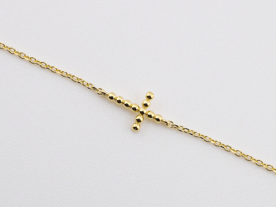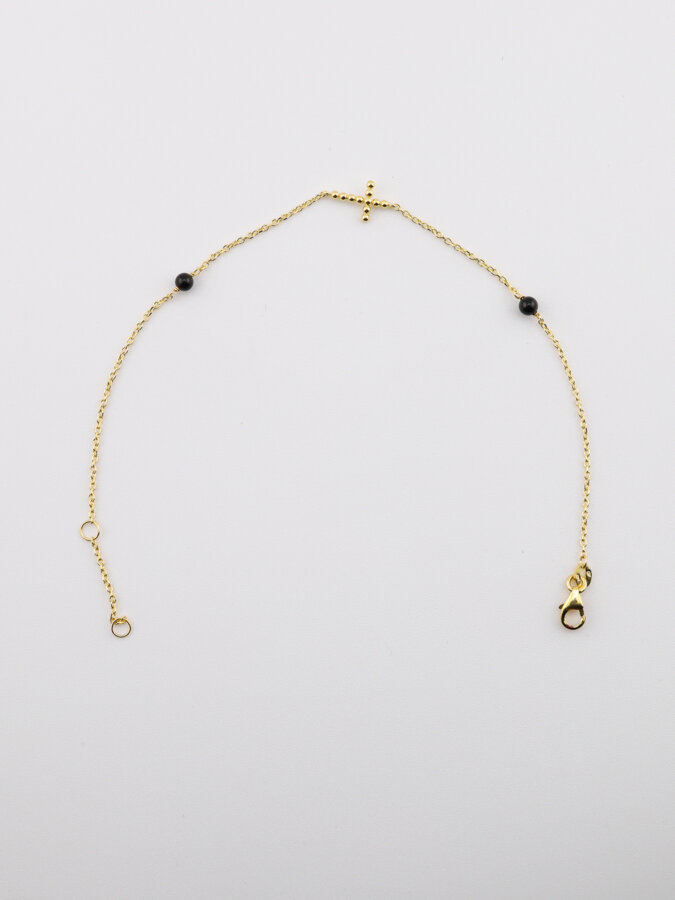 Elegantný náramok s krížikom a čiernymi guľôčkami spája duchovný symbol s modernou estetikou. Minimalistický dizajn vyniká čistotou tvarov, zatiaľ čo čierne detaily dodávajú šperku kontrast a hĺbku. Ideálny pre ženy, ktoré milujú jemnú symboliku a nadčasový štýl.
