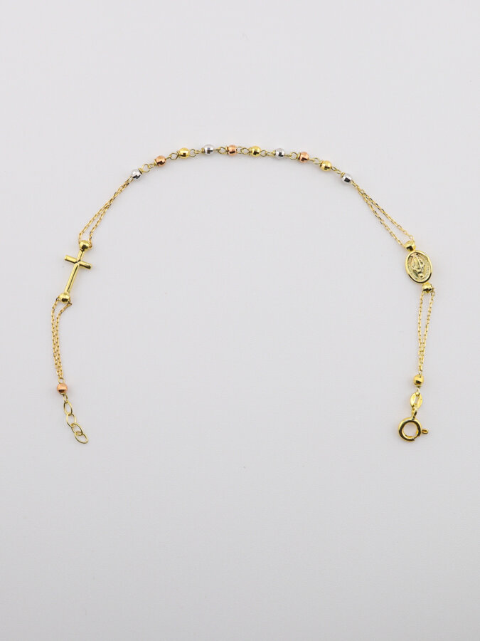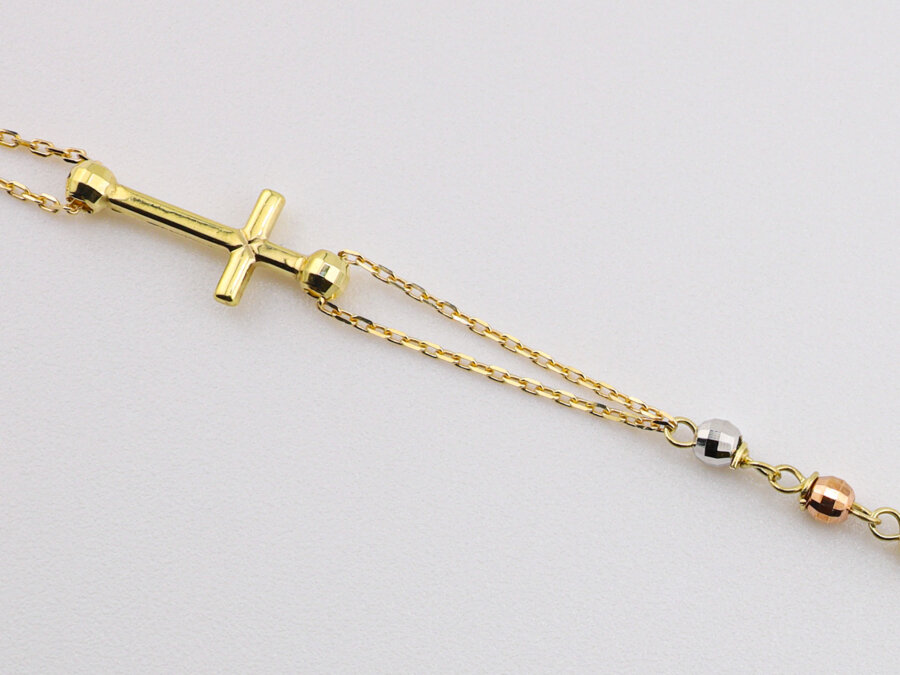 Ruženec je výnimočný náramok, preto bude vždy skvelým darčekom. Náramok zdobia ligotavé guličky v kombinácii žltého, bieleho a ružového zlata s medailónikom panny Márie a krížikom. Tento šperk je vyrobený zo 14 karátového zlata. Súčasťou zapínania je predĺženie, pomocou ktorého je možné regulovať dĺžku. Šperk je skontrolovaný puncovým úradom a je opuncovaný.