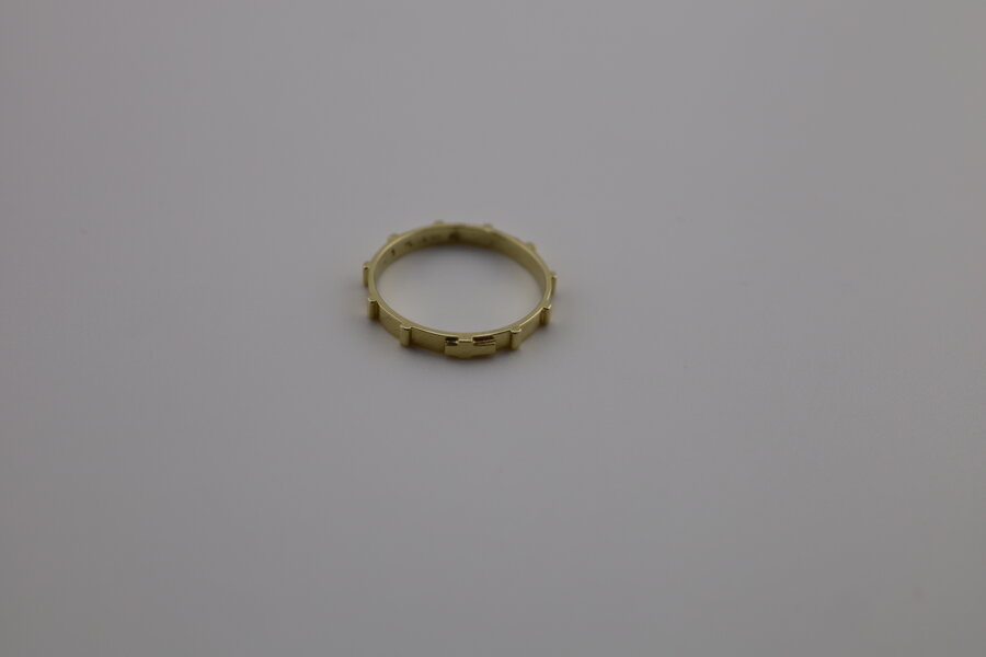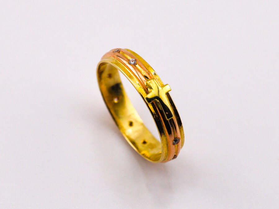 Jemný a elegantný zlatý ruženec na prst s výrazným krížikom a drobnými zirkónmi. Duchovný symbol spojený s luxusným prevedením, ideálny ako osobný talizman aj ako darček.